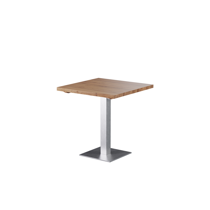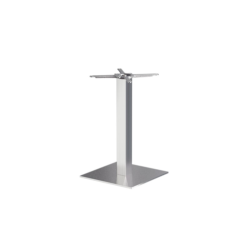 La base de la mesa SIGMA está fabricada en acero inoxidable, altamente resistente a rayaduras y corrosión. Su forma rectangular y el núcleo de hierro fundido oculto en su interior aseguran la estabilidad necesaria en locales de alta afluencia. La columna cuadrada de 8x8 cm aporta un carácter geométrico y definido, mientras que el acabado mate del acero añade elegancia y reduce la visibilidad de marcas de uso.