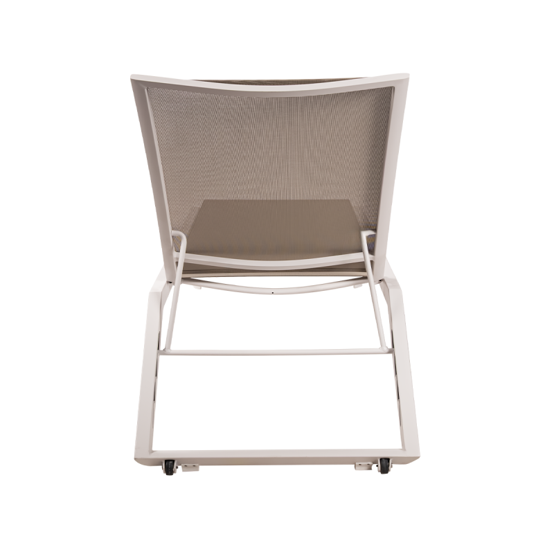 Para el asiento y el respaldo de la tumbona RIVIERA se utilizó el material Phifertex de la marca Phifer. Esta moderna malla de poliéster recubierta de PVC está diseñada para uso intensivo en exteriores. El agua no penetra en la tela, sino que se desliza por su superficie, permitiendo un secado rápido y listo para volver a usar.