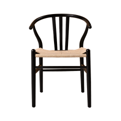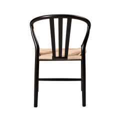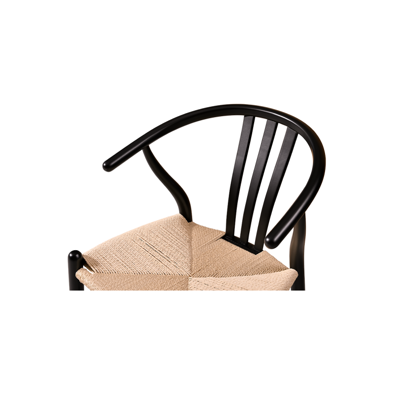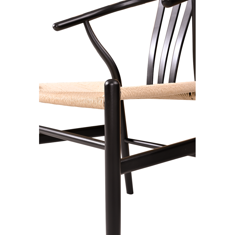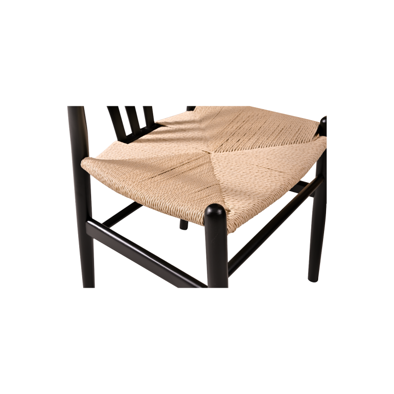 El tono natural de la cuerda contrasta elegantemente con el marco oscuro de la silla, creando una composición equilibrada que combina la artesanía tradicional con el diseño contemporáneo.