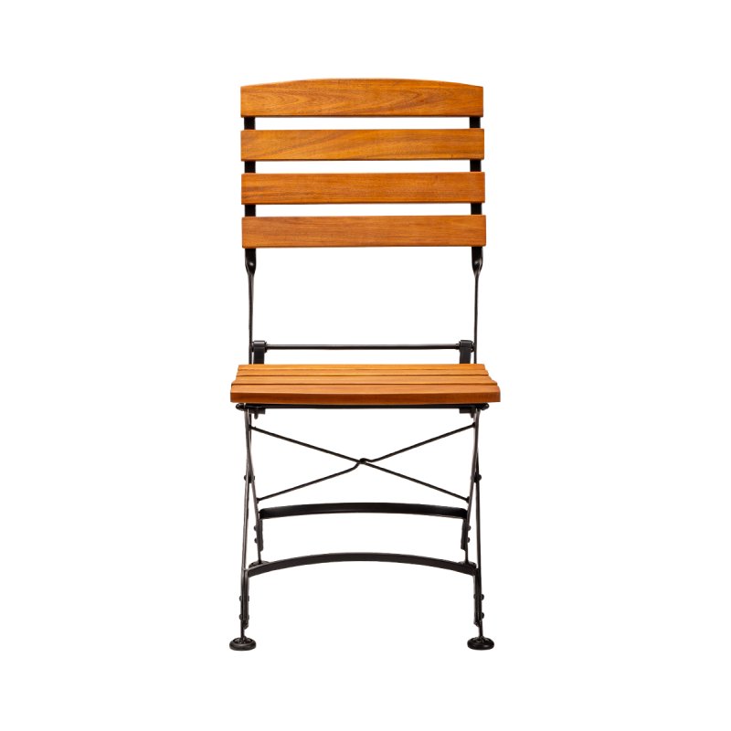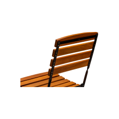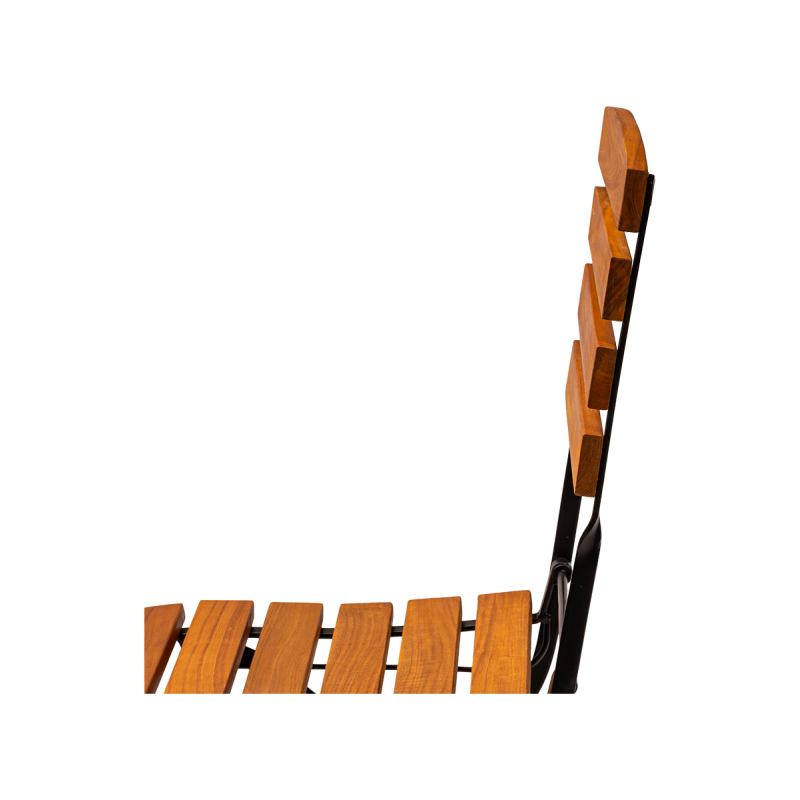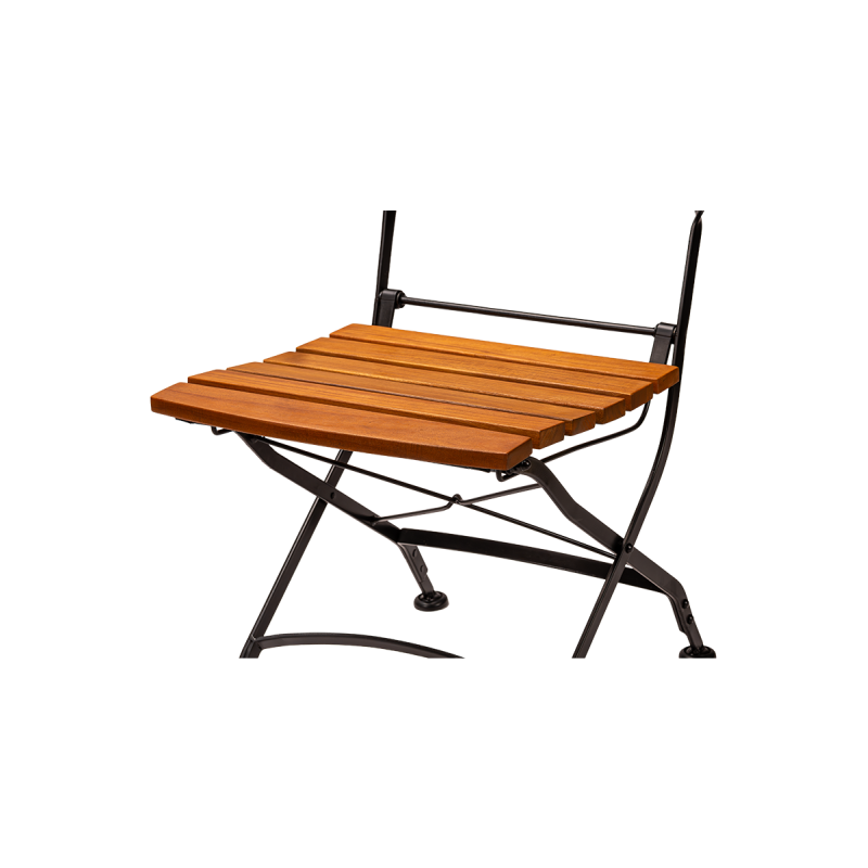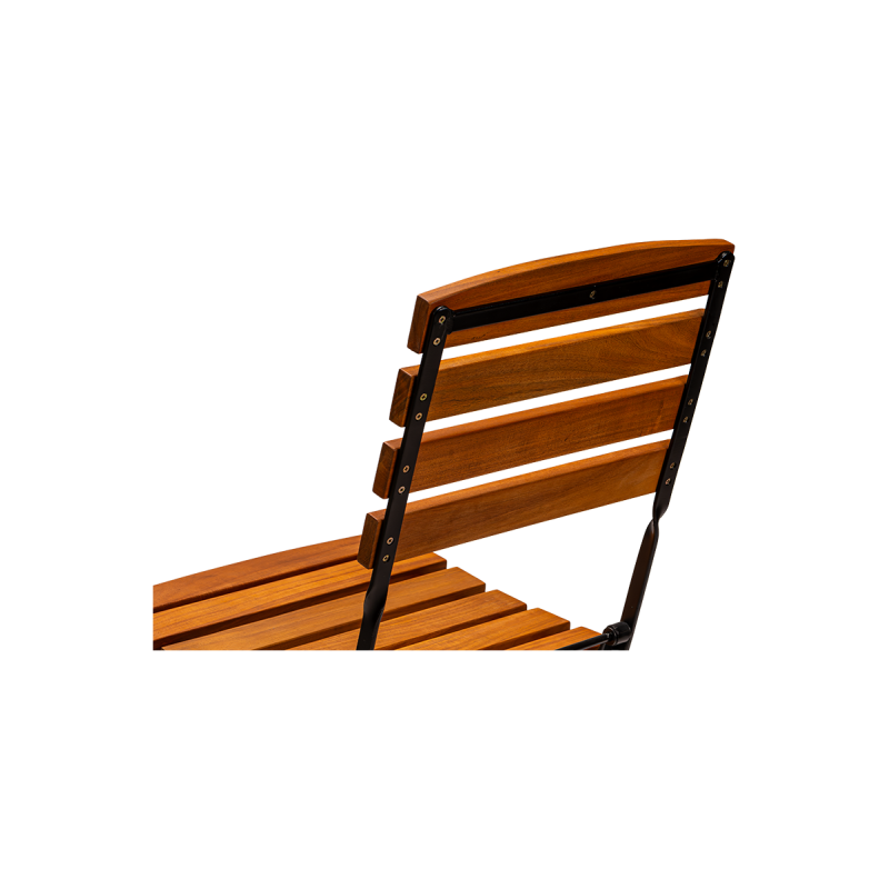 El marco de acero con recubrimiento en polvo negro brillante (perfil de 6 mm) garantiza estabilidad y resistencia al uso intensivo. El asiento y el respaldo están formados por lamas de madera de 19 mm de grosor y 55 mm de ancho, que ofrecen comodidad y un aspecto natural y atemporal. La silla es plegable, lo que facilita su almacenamiento, transporte y la rápida preparación del espacio.