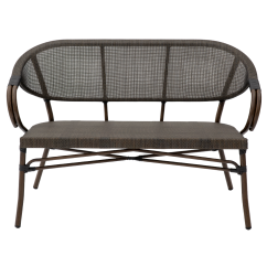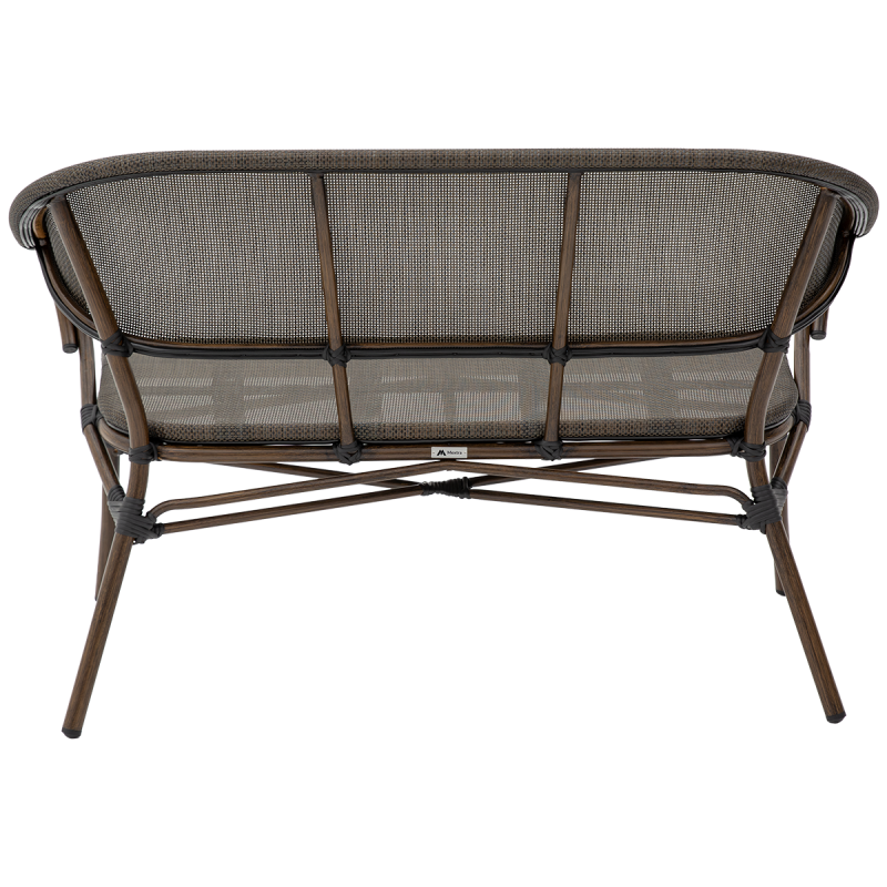 El asiento y el respaldo están hechos de una malla de tecnoratán con tensión uniforme, que proporciona soporte estable durante su uso. La delicada estructura trenzada aumenta la comodidad al sentarse y aporta ligereza visual al banco. Este tipo de tecnoratán mantiene su forma y estética incluso en espacios con uso intensivo.