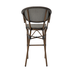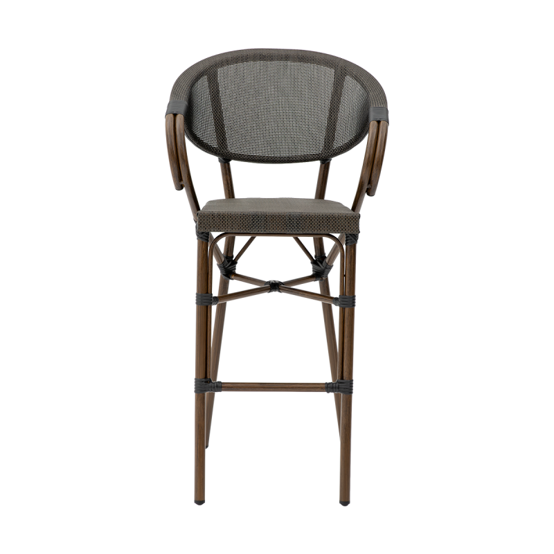 La silla de tecnorratán CAMILLO BAR combina una forma ligera de estilo cafetería con una alta funcionalidad. El respaldo redondeado y los reposabrazos crean un asiento cómodo y envolvente, ideal para mesas altas. El característico trenzado fino aporta elegancia sin recargar visualmente el espacio. Es un modelo que funciona perfectamente como silla para terrazas de bares y como silla de exterior, permitiendo crear composiciones ligeras y coherentes.
